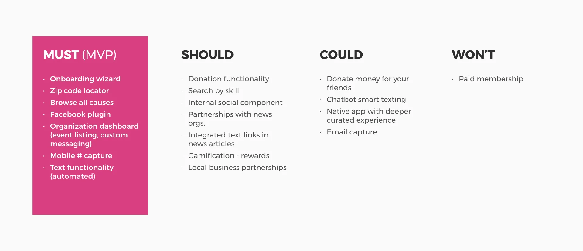 We conducted an in-depth analysis on competing products that provide similar opportunities for volunteers and nonprofit organizations. Below is a matrix comparing some key product features as well as a link to more findings: