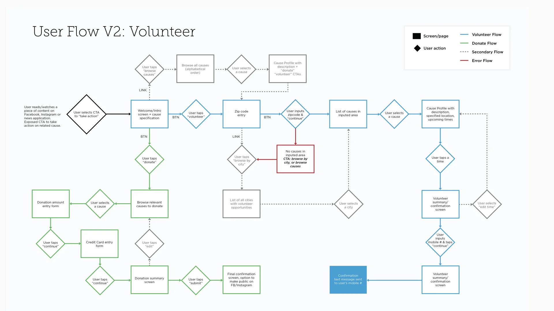 While this product involves a variety of user flows, we initially focused on the on-boarding process for volunteers. While we revised this flow after a couple rounds of user testing, here is an example of an early iteration of a user flow: